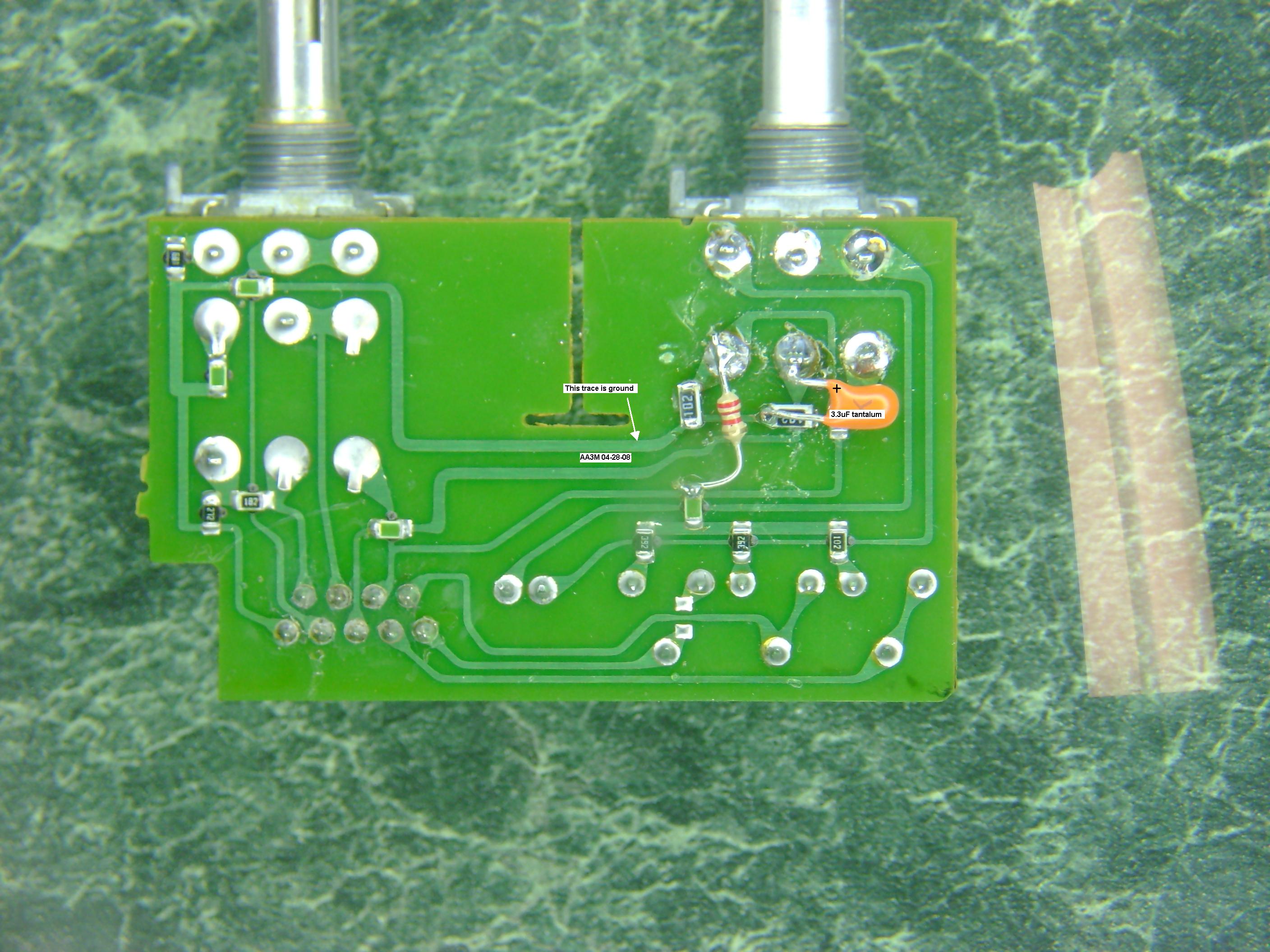 9. Add the 3.3uF @10v tantalum as shown in the bottom photo. Positive lead goes to the pot wiper.