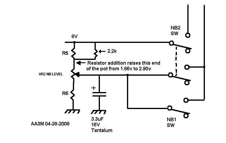 The additional resistor raises the voltage available to Q605's emitter via the level pot (R2). See Figure 7 - Noise blanker circuit in maintenance manual.